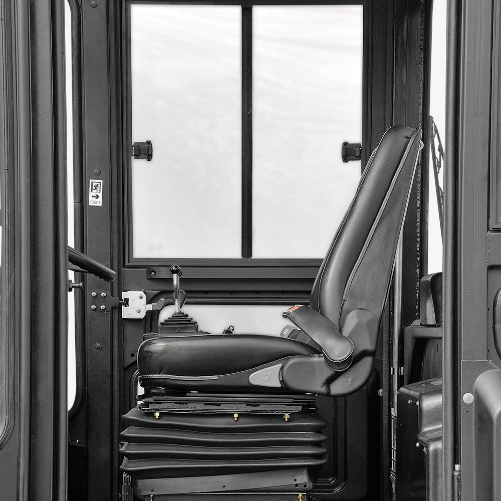 Integral full suspension tilting cabin, connected with the frame through damping rubber, which can shield most of vibration and noise. The tilted cabin which configured wide vision, suspension seat, electric control and hydraulic control joystick, is simple and easy for operation and maintenance. It provides alarge space for drivers legs.